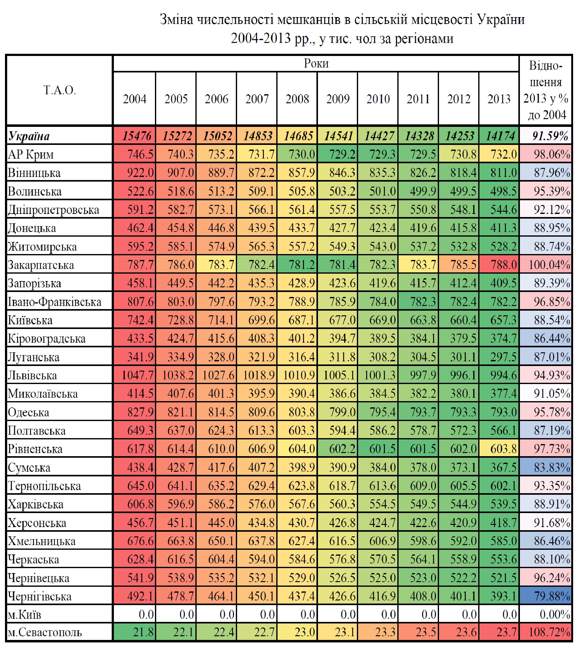 38468Щороку з мапи України зникає кілька десятків сіл, а чисельність сільського населення скорочується високими темпами, при чому для українського села характерне явище «старіння», адже молоді мешканці сільської місцевості часто залишають свої домівки в пошуках кращої долі у містах. Загалом за роки незалежності за даними Держкомстату Україна втратила 475 сіл, а нових було створено 71. Причинами зникнення сіл та зменшення чисельності сільського населення є демографічна криза, урбанізація та старіння нації. Перспективні сільські мешканці переїжджають у міста через безперспективність сільської глибинки – відсутність роботи, розвалена соціальна інфраструктура (не працюючі лікарні, школи, клуби), не дають змоги створити належні умови для організації життя на селі для молоді. За результатами дослідження Департаменту економічних та соціальних справ ООН, починаючи з 70 років минулого століття сільське населення в Україні зменшилося на 13,3 %, в результаті чого 69% населення України мешкають нині в містах, селяни ж складають 31%. Для подальшого вивчення даного процесу розглянемо наступну таблицю, яка відображає зміну чисельності сіл за регіонами протягом 1991-2013 років.